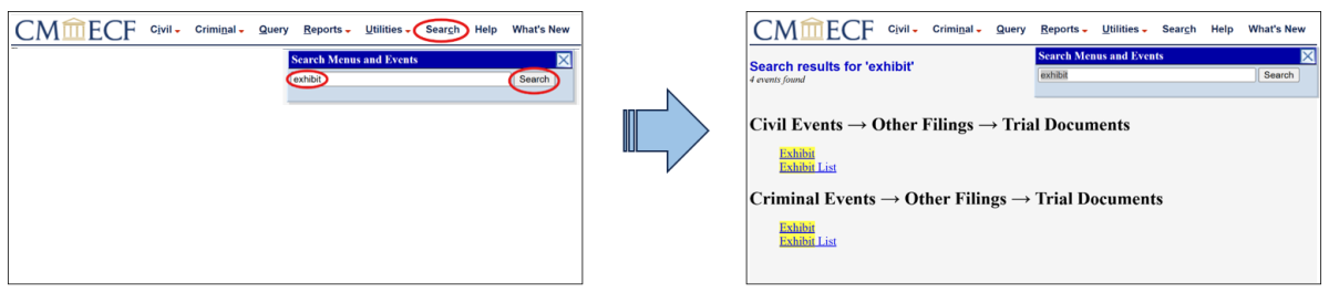 To use this function enter one word such as “exhibit” and CM/ECF will display the category events for Exhibit.
